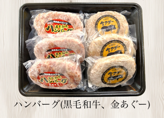 画像の商品説明:黒毛和牛ハンバーグ3個、金あぐーハンバーグ3個